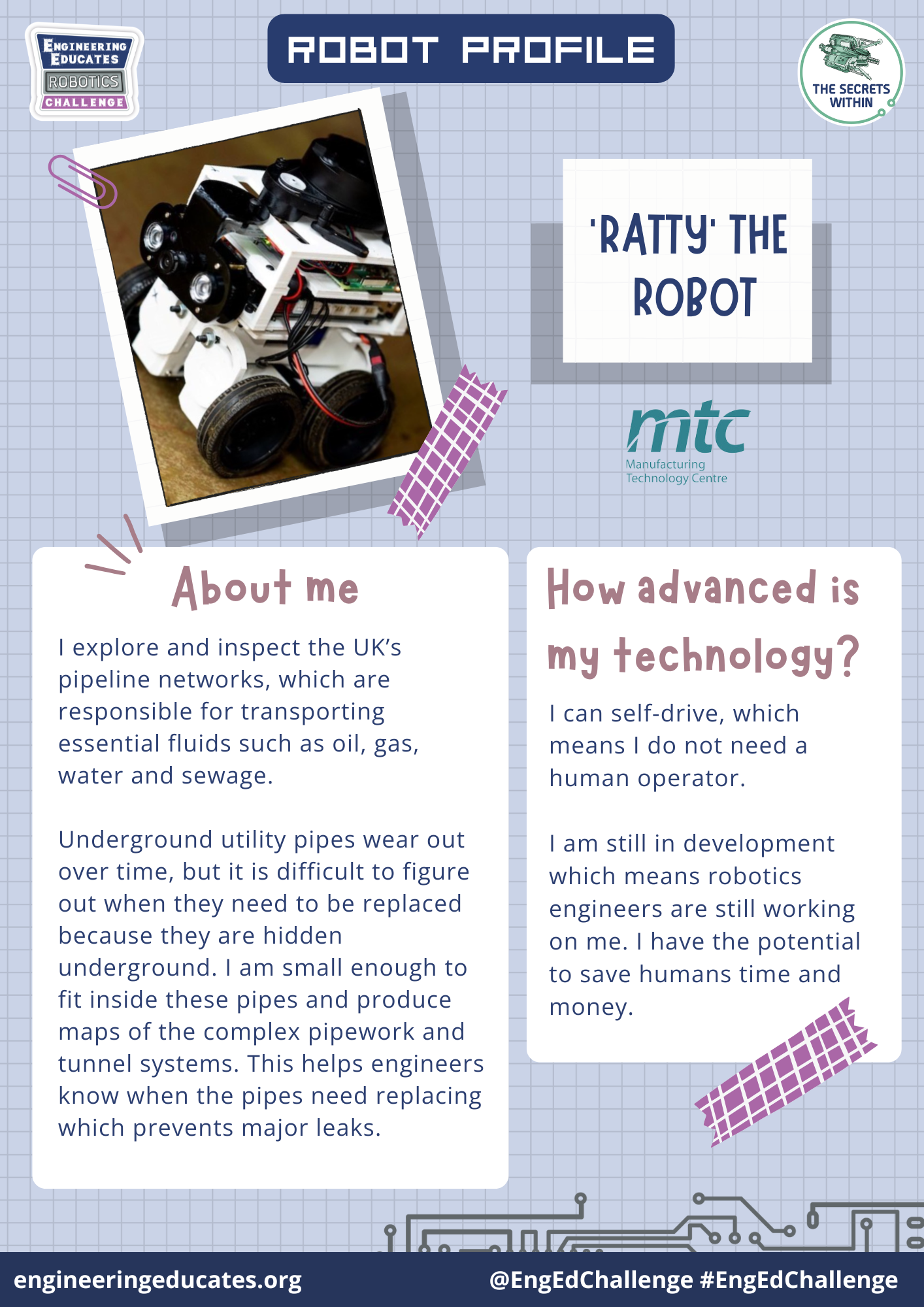 Ratty explores and inspects our essential underground pipe systems for things like oil, water and sewage, to let engineers know when and where pipes need to be replaced.
